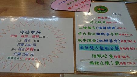 我們點的是之前的活動套餐,所以沒出現在菜單上,但有跟服務生提了一下,這個活動還是有,只是沒出現而已,於是就點了紅酒牛排跟蝦兵蟹將,這兩種套餐。另外這間牛排館飲料跟小美冰淇淋是吃到飽的,難怪座無虛席,人潮一直進來。