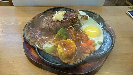另外點的紅酒牛排,紅酒一小杯已經事先淋在牛排上了,牛排是菲力牛排5分熟,吃的當下對紅酒的感覺可有可無,於是我們覺得應該一邊喝紅酒一邊吃著牛肉才對,淋上去都被蒸發掉了。肉質咬起來,嫩歸嫩,但因為比較大塊,所以要咀嚼一下,不難吃,牛排旁邊有一坨飯,有點多餘,雖然老闆立意是好的。