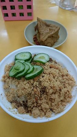 米糕跟油豆腐,米糕的魚鬆對我而言扮演很重要的腳色,糯米本身很粒(台語),是我喜歡的米粒口感,肉燥微甜,配上魚鬆就不會顯得油膩,肉燥跟糯米再加上肉鬆或魚鬆是我最喜歡的組合,若是能把魚鬆磨得更細,就更加美好了,是我小時候的絕響滋味。油豆腐的話,味道沒有很進去,而且偏鹹。