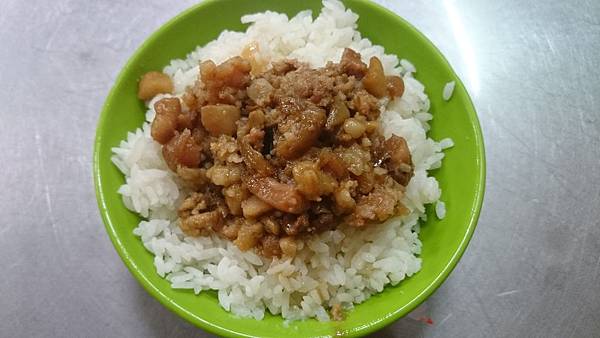 肉燥飯(大),這是隔了非常久之後來用餐所點的,肉燥以肥肉居多,帶點少見的Q度,有放了油蔥在裡頭提味,味道鹹香可口且些微甜度平衡了鹹度,讓我還蠻喜愛的。另外白飯很粒,滷汁淋得剛剛好,一整個非常合搭,我認為比腿庫飯好吃很多。