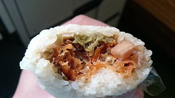 飯丸(大),對我而言還蠻小顆的,忘了買小的比較看看。飯丸裡面有油條、肉鬆、蘿蔔和酸菜。主要鹹度來自肉鬆,油條非常香酥脆,白飯煮得還算乾硬,是我喜歡的飯糰素材,看樣子要點辣的口味會比較豐富。