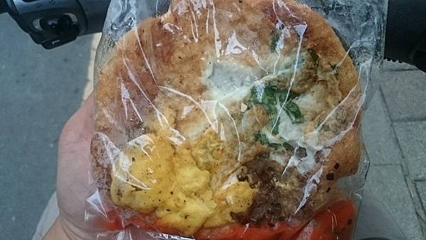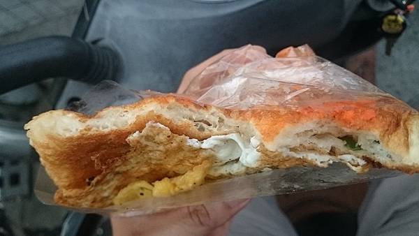 蔥肉餅加蛋,整個跟我攤開的手掌一樣大,調味料是自行添加的,看別人以前寫的食記是用小刷子刷醬料,現在有可能顧及衛生問題,就改成使用瓶罐了。這間是屬於半煎炸,所以放入塑膠袋內會顯得油膩,但吃起來一點也不含油。餅皮最外圍非常酥脆,再往內一圈雖然還沒有內餡包裹,但能咬得到柔軟的麵皮,又有油香跟醬料加持,所以也不會顯得太乾,最裡面部分就是有少量蔥和肉末的餡料,肉末我吃起來有帶點沙茶味,不知道是不是我的錯覺,沾附的雞蛋也一併煎得香氣四溢,整體來講就是軟酥香和各種味道交雜一起,既不顯得突兀又能相得益彰,這間是能讓我有衝動再回購的店家。