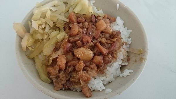 肉燥飯,肉燥以肥肉居多,鹹香味很足,甜度尚可,搭配的酸菜是最佳良伴。