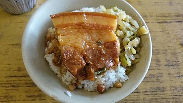 魯肉飯,肥肉部位很大塊,油膩感也大幅上升,還好有酸菜能解膩。魯肉軟嫩油香,肥肉入口即化,鹹甜交融,蠻好吃的,只是肥肉的大小能適中一點比較好。