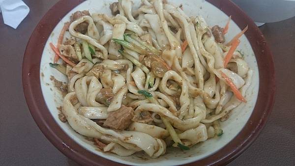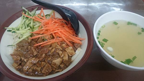 炸醬麵,配菜就紅蘿蔔絲和小黃瓜絲,而且還附一碗清湯,它的炸醬是大塊的肉塊和豆乾,麵條用的是寬麵。麵條有厚度但不Q彈,炸醬嚐起來好像有用紅糟下去調製,鹹甜相襯,攪拌均勻能讓每根麵條都裹上炸醬味道,整碗吃下來非常有飽足感。
