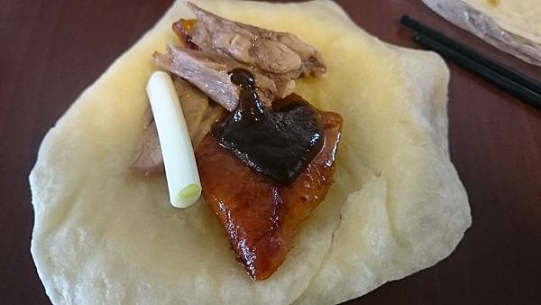麵餅包烤鴨,這就是大眾熟悉的北平烤鴨吃法,店家的鴨肉肉質細嫩結實,更不用說那烤得酥脆的鴨皮,加上蔥白和甜麵醬,最後再用香甜有厚度的麵皮把所有食材都包裹一起,一口咬下真的是人間美味,尤其此鴨肉的油脂更是潤口,加強了鴨肉的鮮嫩更提升了整個食物的美妙滋味,寫到這又想再去買來好好地享用一下。
