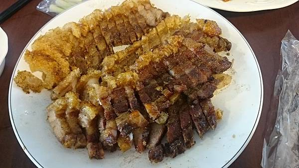 燒肉,這邊的燒肉指的是港式的化皮燒肉或者燒臘店的火肉,就是把肥皮炸得香酥的三層肉。它切得比較薄,那個肥皮幾乎酥化掉了,一咬下去就是用聲音表達完全沒有隔閡,肉的鹹度比較適合配飯,單吃的話稍嫌又過油,但是我非常喜歡他的炸皮,愣是奇妙。