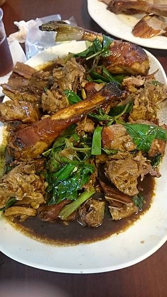 炒鴨骨,這盤的調味偏甜,就是配飯專用,給想好好啃食骨頭邊肉的人一個享受。若是吃麵皮包鴨肉的人嫌棄甜麵醬鹹度太過的話可以嘗試沾取這盤醬汁來搭配,別有一番風味。