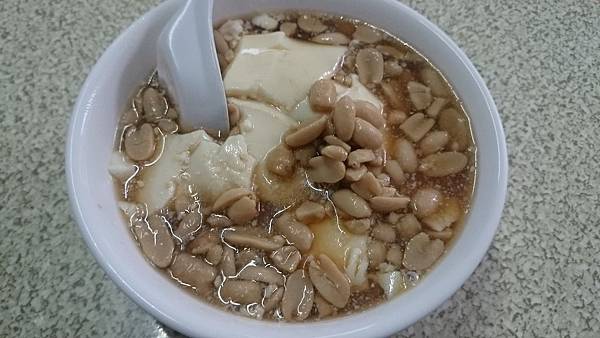 花生豆花,花生給的超級多,形狀維持完整性且口感鬆軟。豆花則綿密柔順,進入口腔化掉的速度也很快,不會這麼纏人,因為有些豆花嘴巴抿開後停留時間比較久,這間的就不會。給的糖水稍微甜一點,但我喝不出是黑糖或紅糖還是二砂糖,所以應該是店家特製的糖水。