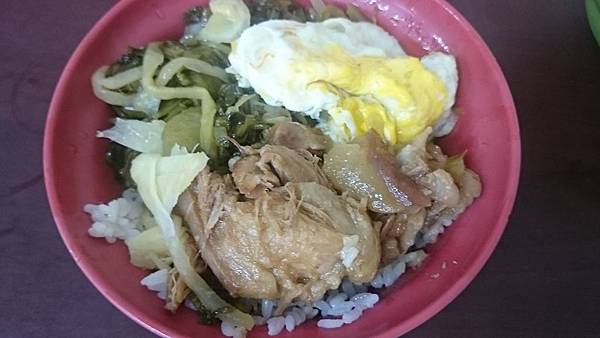 爌肉飯,雖然價格略貴,但還有荷包蛋和酸菜跟一整塊爌肉,零零總總加起來倒還合理。這碗飯的重點就在那爌肉了,就算有了淋飯的醬汁還要搭上爌肉會變得更加美味。爌肉肉質軟嫩,肉絲分明,很像辦桌菜的烘肉,只是這個口感更佳,肥肉部分油香鮮腴,舌尖輕輕一頂就能化開,一口白飯一口肉,非常滿足。