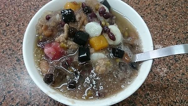 八寶冰,雖然號稱八寶,但配料卻有10種以上。紅豆、綠豆、大豆、薏仁、珍珠、Q圓、湯圓、地瓜圓、鳳梨、芋頭、仙草和愛玉,給料非常豐富,價格也實在,難怪在地開業許久生意始終屹立不搖。糖水是用二砂糖下去熬煮,因為剉冰給很多溶化後就不會很甜,而所有配料裡我最喜歡仙草,味道鮮明,結構體完整有口感,值得飽餐後來這吃碗甜品當作美好晚餐的結束。