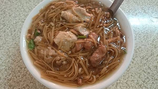 麵線焿(小),裡面的料是魚漿和赤肉,不是常見的大腸和蚵仔。麵線較粗,介於細麵跟麻油麵線之間,所以有稍微保留住麵條的口感。雖然點的是小碗,但份量不少,肉塊也很多,魚漿偏軟,赤肉滑溜,我喜歡赤肉口感勝過魚漿,中午不太餓可以來這邊點個一碗就能管飽。