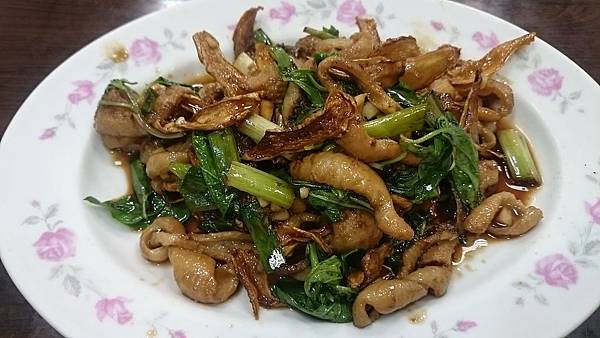 三杯大腸,對於大腸來講這算是比較少見的調理方式,雖說是三杯但沒有收汁,這比較不合我的胃口,像是薑絲大腸換湯不換藥而已,所以大腸的口感是軟Q有彈性,而麻油味道蠻重的,薑片只能算裝飾,沒有乾煸到能吃的地步,也少了好吃的大蒜頭搭配,有點可惜。