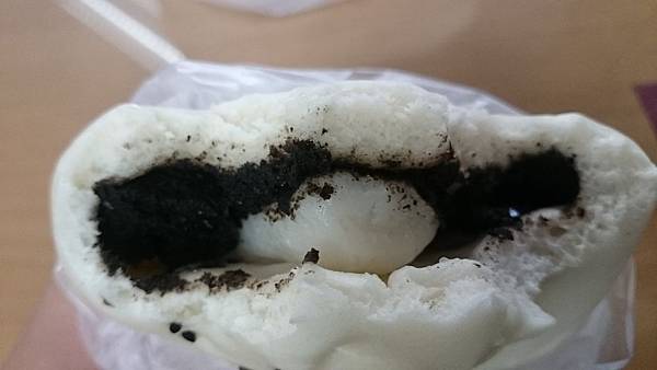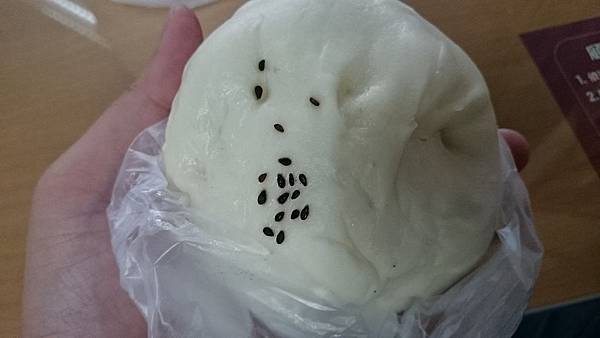 芝麻麻糬包,看到包子皮的幾粒芝麻就知道是芝麻口味了,包子皮口感已經敘述過了,是同樣的風味。內餡的芝麻不是顆粒狀的,竟然是走綿密風格,也沒有芝麻的苦味,甜度跟包子皮很融洽,出乎我預料之外的好吃,只是麻糬就沒什麼亮點,一個軟軟的物體罷了。