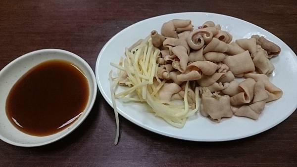 鴨腸(乾),鴨腸口感脆歸脆,但還是要多咀嚼幾下,是屬於硬脆的,說不定要點鴨腸湯才能吃到爽快俐落下就能咬斷的軟脆鴨腸,沾醬是鹹甜醬油膏,搭配這道無味的鴨腸剛剛好。