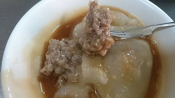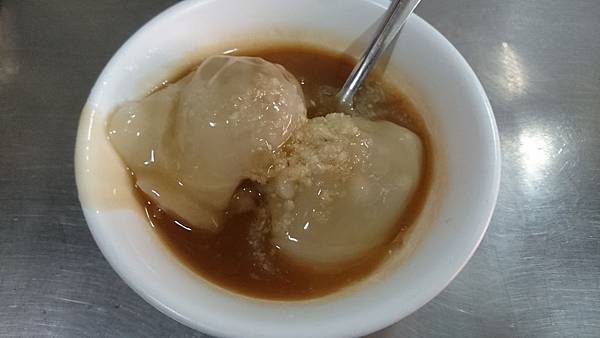 肉圓,一顆5元,看這大小和價格,我終於了解到為何會這麼多人排隊了。肉圓皮非常軟黏,延展性極佳,要確實咀嚼完再吞下去,以免噎到。內餡肉團給的很大方,有適當調味過了,吃起來滑順飽口,個人很喜歡這個肉的味道。桌上有辣椒醬和番茄醬可自行添加,蒜末老闆娘會詢問要不要加進去。