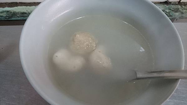 綜合湯,這碗10元,價格也是很便宜,兩顆魚丸和一顆貢丸,個人偏好魚丸,咬起來比較脆一點。且湯頭很清澈,所以我都把湯加進剛吃完的肉圓碗裡,這樣能提升味道豐富度。