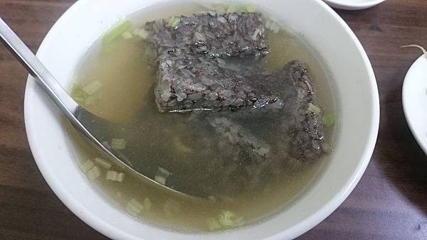 米血湯,先說湯頭,是薑絲和冬菜的混合體,但不會嗆辣,喝起來甘甜順口。米血的話,因為是浸泡在湯裡,所以整個呈現狀態是比較鬆軟的,且單吃沒什麼味道,建議沾點店家的豆瓣醬和辣醬來增添風味。