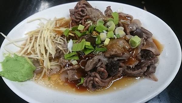 虱目魚腸(乾),沒上桌之前我以為是用炸的,沒想到跟阿真虱目魚的一樣都是煮熟就上桌了,只是兩邊的做法有所不同。這間的魚腸沒有苦澀味,就是一個鮮字,口感因為腸子的關係有點Q彈,配上鹹甜醬油膏也很對味,附的薑絲和哇沙米可以用來提味解膩。