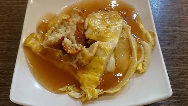 可樂餅蛋餅,吃完覺得可樂餅是多點的,其實點原味蛋餅就足夠了,可樂餅是馬鈴薯泥口味,牛奶味稍重點,外皮被蛋餅包裹住也不失脆度。店家蛋餅就是手工麵糊下去調製而成,吃起來非常軟,這個口感我特別喜歡,蛋香也很濃郁,而整盤最大的重點是淋醬,很像放在蚵仔煎上頭的醬料,鹹甜滋味又有點微辣,稠稠的且能完整附著在蛋餅上,真的好吃,難怪店家也會兼賣蚵仔煎,一醬雙用就省了很多功夫。