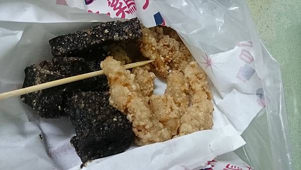 米血和魷魚,米血外皮微酥但稍硬,裡頭軟嫩度我是不太滿意,且還會有點黏性。魷魚則是我的最愛,每次光顧不管點什麼一定要有魷魚,因為我就喜歡它那甜而不膩的醃漬味道,加上魷魚本身口感也有咬勁和彈性,又是薄炸粉且是顆粒狀的,在三重攻擊之下我不臣服還蠻難的,算是我在鹽酥雞攤中吃過最好吃的炸魷魚。