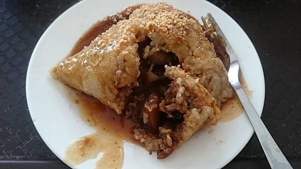 肉粽,糯米蒸煮得很軟爛,整顆都熟透了,裡面包了五花肉和鹹蛋黃,內容物有點乏善可陳,但五花肉的軟嫩度還不錯,米粒熟爛狀態也是我可以接受的。