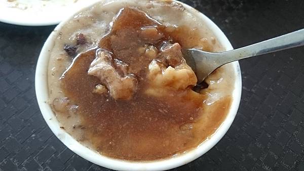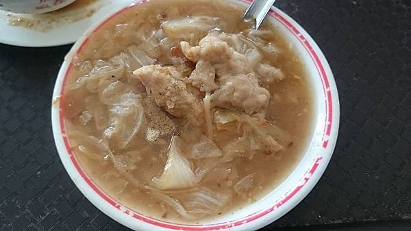 肉羹,湯頭就是以扁魚來打底的,上桌前店家已經把要放的黑醋醬油什麼都撒上去了,而羹的濃稠度則偏低。裡頭放了不少的白菜和醃漬赤肉,赤肉因為有裹粉,所以口感很軟嫩,但不知道為什麼總覺得湯頭調味讓我有點不太喜歡,喝完又說不出來哪邊怪。