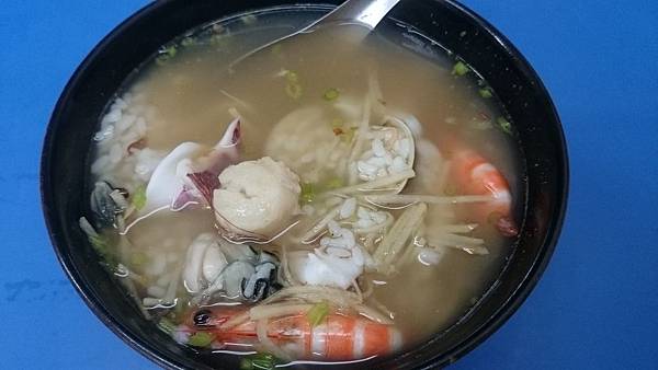 海產粥,這碗裡頭的料有蝦子、蛤蠣、蚵仔、花枝和干貝,筍絲是來增加口感的。說是粥其實是飯湯,因為飯粒的咬勁有被保留下來,不是熟爛的,且湯頭的鮮是無庸置疑,有薑的風味卻見不到其蹤影。每種料的新鮮程度無可挑剔,蝦子彈、蛤蠣肥、蚵仔鮮、花枝脆、干貝軟,各有各的特色和口感,想吃點新鮮海味來這準沒錯。