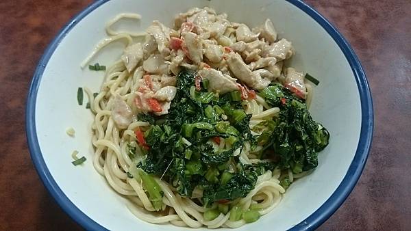 雪紅辣雞麵(大),我記得我菜單劃的是辣雞拌麵,卻突然跑出雪裡紅來,但既來之則安之,只要好吃送錯我也沒差。先說麵條,麵體屬於圓筒狀且又大條,富有彈性和咬勁,然後份量不少。不知道是不是我的錯覺,這碗調味帶點麻油香氣,讓每根麵條都光滑油亮,吃進嘴裡因為有油脂的保護,辣度被稍微降低,順口許多,是讓人喜歡的味道。雞肉不乾柴且辣度對我來講很強,都辣到流鼻水了,最後雪裡紅有讓我意外到,竟然沒有苦澀味,變成一般青菜的味道,挺好吃的。