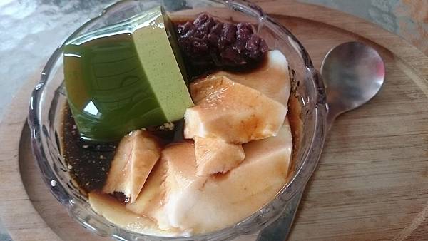 茶凍豆花,糖水是用了黑糖,味道濃郁稍甜,紅豆則熬煮得很軟爛。茶凍還不錯吃,但黑糖太搶戲了,讓抹茶味道一直被蓋過。主角鹽滷豆花吃起來介於古早味豆花和布丁豆花的口感,既綿密又有晶瑩感,真的很特別,價格再便宜點就更美好了。