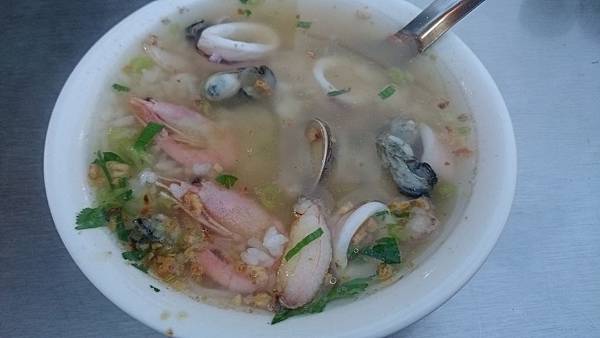 海產粥,跟大昌海鮮粥一樣都有個粥字但其實還是飯湯,白飯給的有點少,湯頭則清淡爽口,少許油蔥酥來提味,蠻好喝的。粥料有甜蝦、蟳肉、花枝、蛤蠣和蚵仔,全部都很新鮮,有兩樣比較讓我有印象,花枝口感Q彈又堅韌,極富咬勁,甜蝦蝦頭有蝦卵可以吃,記得剝開來食用。