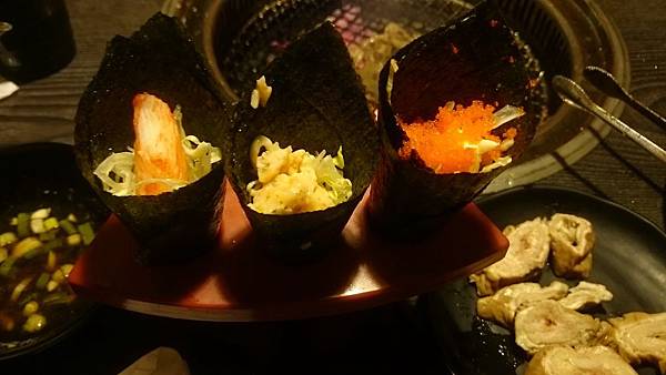 各式手卷,友人點的所以我拿來拍一下,我只吃了其中的一個蝦卵手捲,手卷裡面不是包飯,而是用生菜絲來取代,這樣就不會造成飽足感了。