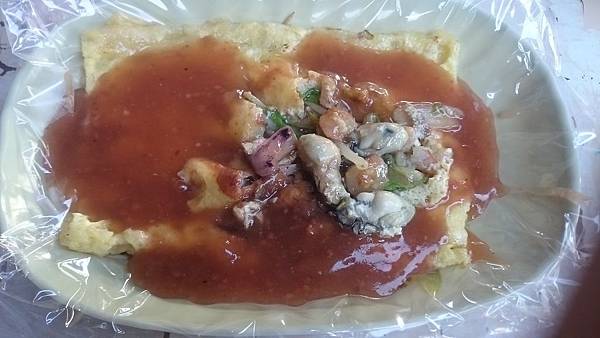 綜合煎,裡面的料放了蚵仔、蝦仁和花枝。蚵仔新鮮又大顆,蝦仁體積就比較小了點,口感降低許多,花枝咬起來依舊軟Q,店家醬料則不怎麼甜,但還是吃得出有番茄醬的痕跡。至於蚵仔煎最重要的粉皮,店家份量弄很多,皮的延展性極佳,有把滑Q的特性發揮出來,但比較可惜的是還是有點粉感,讓人吃到正享受時會稍微皺起眉頭。