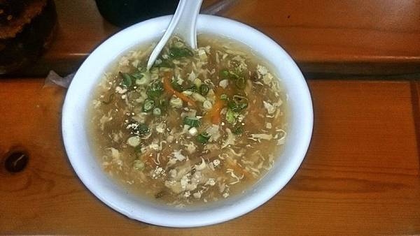 酸辣湯,湯料有筍絲、蛋花、肉絲和豆腐絲,樣式較少,喝起來沒有什麼酸勁,只有胡椒辣度而已,另外湯頭還頗為濃稠的。