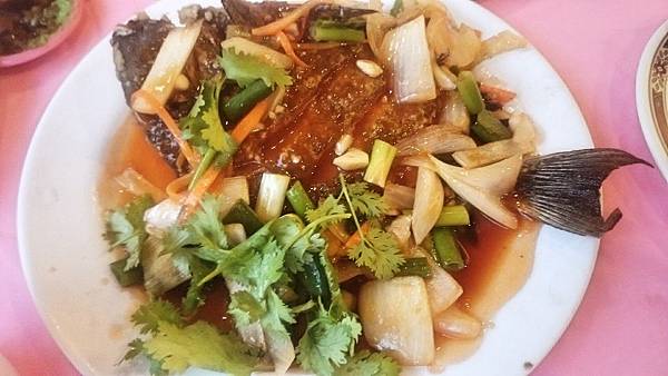 紅燒倒吊魚,本想吃乾煎的,可惜店家沒有提供此做法,所以變成紅燒口味,可是這調味又帶點酸度,只好算是紅燒和茄汁的綜合體。這魚肉口感很威,細膩程度遠超過刺鮭,吃在嘴裡一下就散開了,且魚皮也煎到我最喜愛的赤香程度,讓這道菜獲得我們極大的好評,整個吃完只有魚頭沒吃掉,連骨頭的邊肉都喀光了,非常推薦點來嚐鮮。