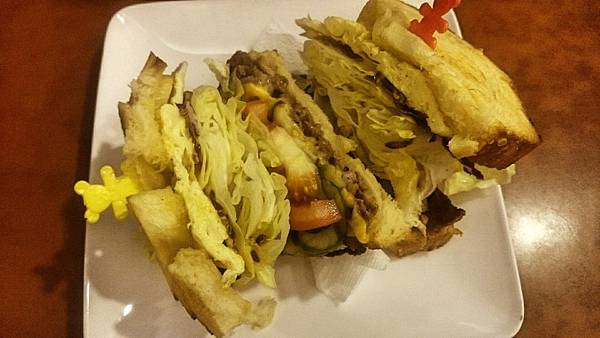 黑胡椒牛肉丹麥總匯,丹麥吐司的脆口口感一直是我的最愛,可是還要再加價所以很少點來吃,今天因為有兩個人來分攤,於是就把土司換成丹麥了。果不其然,脆皮程度依舊,不油不乾,吐司中間放了不少生菜,適合大口咬下的飽嘴狀況。唯一敗筆在於牛肉,給的不是有濃郁滋味的手打牛肉,而是細碎牛肉片,整個等級下降許多,口感也差了不少,實在可惜。