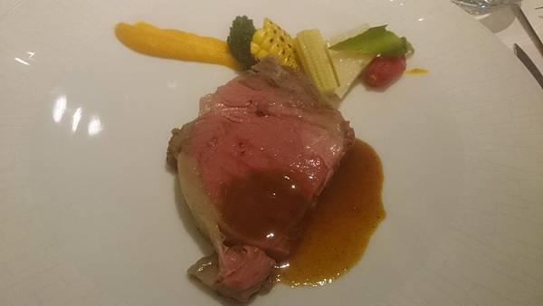 奶油雞汁佐松阪豬厚切培根玉米餅及碳烤時蔬,奶油雞汁真的很雞汁,可是奶油味道並不太明顯,時蔬好像是櫛瓜,口感屬於軟爛的,非常好咬。松阪豬的脆度在這道菜色上沒有呈現出來,卻跑出肉質的柴感,若不是有培根的油脂來加持,其實口感愧對松阪豬這個名字,所以紅酒的搭配上並沒有幫到餐點,只有單向的替紅酒加分而已,讓紅酒少了前一款的礦物感,但酸度更強烈了些,搭配度我會給30%吧。