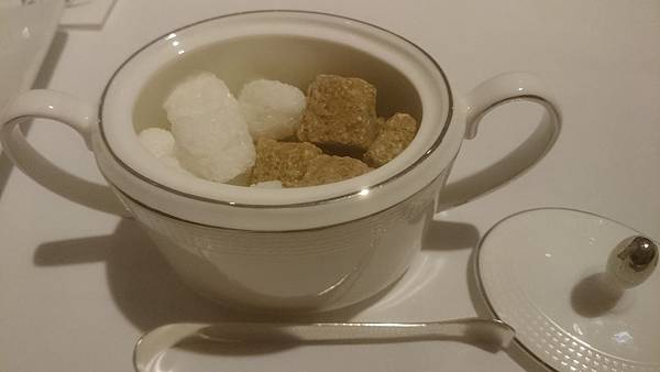餐後飲料的咖啡方糖,因為黑糖或者紅糖在餐廳比較少見,就拍來紀念一下。