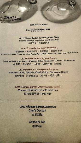這是今晚的餐酒會菜單,每種菜色都會搭配不同款式的紅白酒,對於我這個新手來講只能按照餐廳所搭配按部就班的享受整個過程,有專業人士幫餐點配上適合的酒款再好不過了。