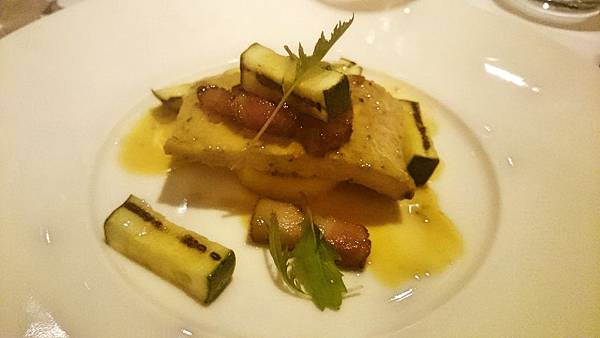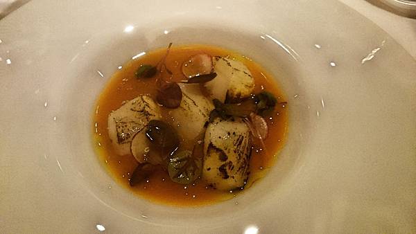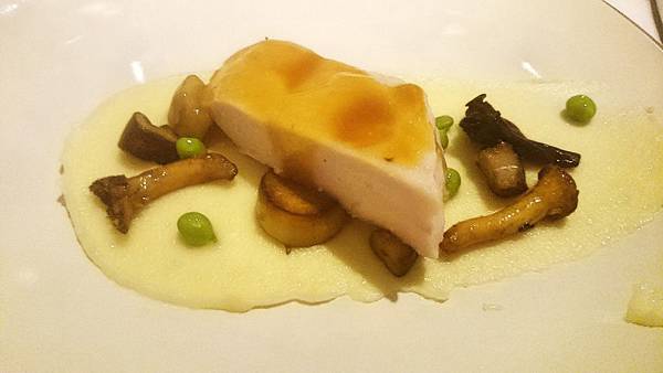 炙燒干貝佐時蔬鮮果凍,這道干貝深受主揪的喜愛,軟嫩程度無與倫比,一咬下去就化開來,沒有干貝絲的口感殘留又帶點炙燒香氣,真的美味。時蔬鮮果凍的話,說是凍倒不如講是濃稠醬汁,嚐起來的味道就像是有酸度及胡蘿蔔口味的某牌果菜汁,但跟第一杯白酒的搭配來講,已經沒留下什麼印象了,所以這道搭配度大概是40%左右吧,因為餐點本身表現太亮眼了。