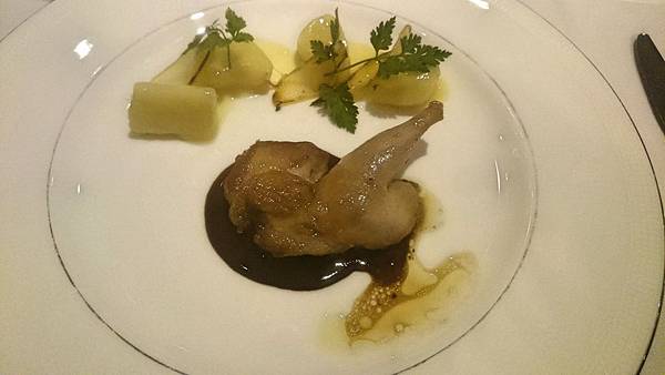 巧克力醬汁佐嫩煎鵪鶉及漬洋蔥洋芋麵疙瘩,這醬汁真的有點獵奇,是苦鹹味道的,洋芋麵疙瘩則吃不出是洋芋做的,非常像麵粉揉製的麵疙瘩,但沒有麵粉的厚重感,還不錯。鵪鶉的話,分別有兩種口感,前半部的皮有烤過香氣,肉質算是有嚼感,連接腿的部分則是軟嫩中帶點咬勁,而這道搭配的紅酒單寧度是最高的,所以酸氣非常強烈,還好巧克力醬汁的苦味能引發出紅酒的甜和壓抑其酸性,變得溫和許多,所以搭配度來講我會給60%。