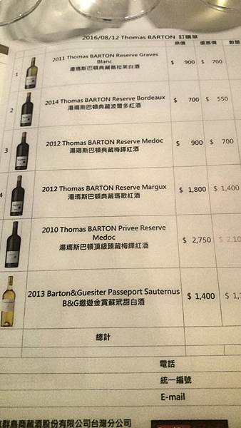 這是這次跟餐廳合作的法國B&G巴頓酒莊所提供的酒單,我也不太懂其好壞之處,只能相信餐廳和酒莊的專業了。