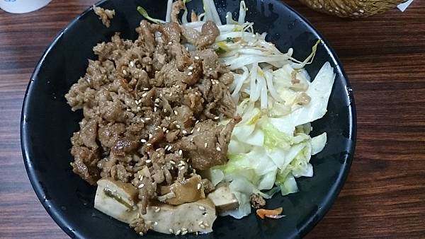 招牌烤肉飯,豆芽菜和高麗菜很清脆,豆干就家常味。烤肉吃起來軟而不柴有嚼感,醃漬方面頗為入味,以鹹甜滋味又帶點沙茶為主,讓每口白飯都有醃漬烤肉味道的元素在裡面,讓人有種越吃越涮嘴的感覺,難怪店家生意強強滾。