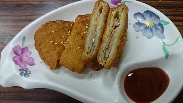 起司豬排,就是常見的藍帶豬排,外皮酥脆有點厚度,還好不膩口也沒有麵粉感。豬肉跟火腿一樣薄,口感是軟的無誤,整體來講中規中矩,且蕃茄醬的去膩效果不錯,好啦誰叫我是蕃茄醬愛好者。