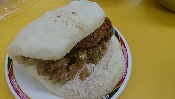 割包,看那糖粉好像不用錢似的撒在上面,可想而知這甜度應該頗為驚人。割包的包子皮有點軟黏,會纏在舌頭和口中,但咀嚼之後就會散發出甜度來。裡面夾的滷肉是半肥半瘦,肉質軟嫩無比,肥肉則有把醬汁味道給滷進去,所以完全不會油膩又一咬就化開,這滷肉讓我很讚賞。酸菜一點酸度都沒有,只能增加脆口度,倒是糖粉發揮的作用比酸菜更好。