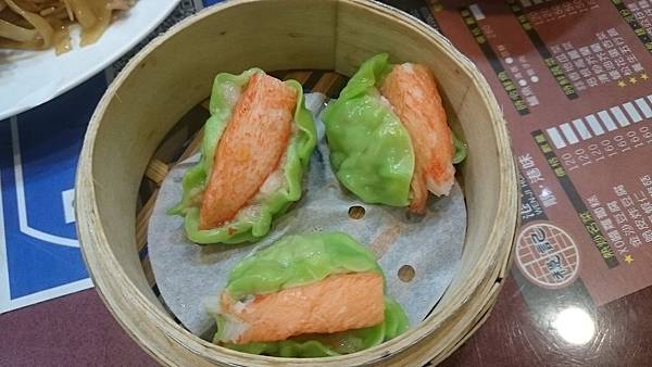 鮑味鳳眼燒賣,上頭有一整根的蟳肉,內餡還包了彈牙的蝦仁,用料蠻實在的,且調味適當,是好吃的燒賣。