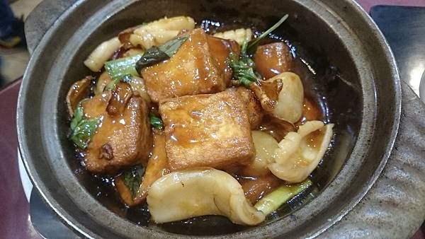 三杯海鮮豆腐煲,說是海鮮可是只有花枝而已,口感軟彈有咬勁,三杯是屬於未收汁狀態,接受程度就看個人喜好了。豆腐是老皮嫩肉的作法,外微酥內軟鮮,搭上三杯醬汁還蠻不錯的,這道有在普通水準之上。