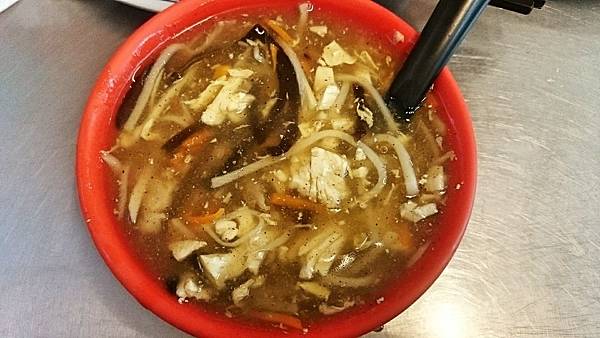 酸辣湯,調味非常有酸度,剩下的就是胡椒辣味。而湯料有豆腐、筍絲、黑木耳、胡蘿蔔絲、肉絲和蛋花,裡面每種食材都還不錯,除了肉絲外。因為帶點肥肉,但豬肉味道有點突出,跟這碗湯完全不搭嘎,有種多餘的感覺,就是多了那塊餘阿。