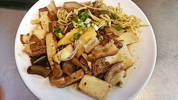 綜合滷料(小),這盤滷味是店家搭配的,有豆干、豬頭皮、魚板、小腸、海帶、豆皮、百頁豆腐和一些我認不出的食材。調味可以自行去增減,各項食材有相對應的口感,除了豆皮有點鹹之外,其他的就都在普通範圍裡。