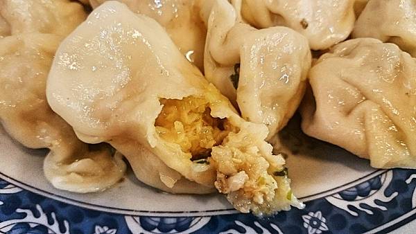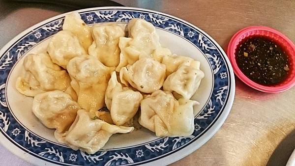 水餃,沒有寫是什麼口味的,但我猜是韭黃或高麗菜吧,因為蔬菜被剁到超細碎,只能靠顏色去辨別。整個肉餡口感就是軟爛,而水餃皮則是有點厚度,尤其是那接合處,有種吃麵糰的感覺,只能說不合我的胃口,另外建議沾點店家調醬,還比較好吃一些。